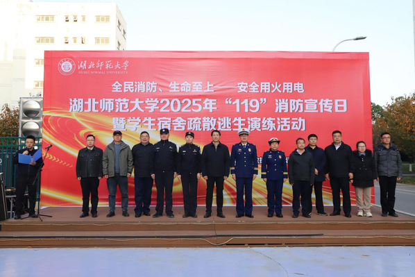 本网讯 为进一步提升师生消防安全意识,夯实校园消防安全基础,11月21日,学校联合黄石市消防救援局、黄石港公安分局、黄石港区消防救援局开展2025年消防宣传日暨学生宿舍疏散逃生演练活动。校党委副书记、副校长余涛,黄石市消防救援局党委委员、副局长罗朝会、黄石港区消防救援局局长陈薇、黄石港公安分局副局长杨志、沈家营派出所教导员李晓辉出席活动。学校党政办、宣传部、学工部、国资处、保卫处、基建处、团委、后勤管理中心、湖北湖师教育科技发展有限公司等各职能部门负责人以及各学院辅导员、学生代表、宿管科工作人员等200余人参加此次活动。