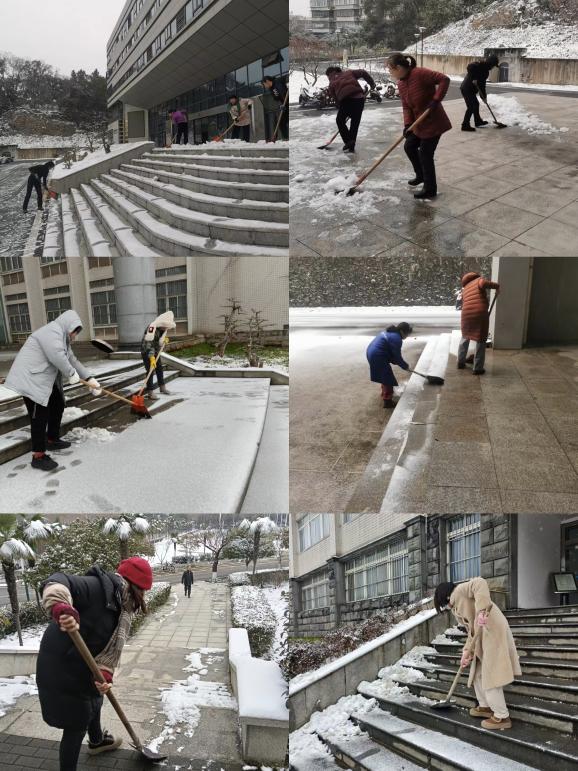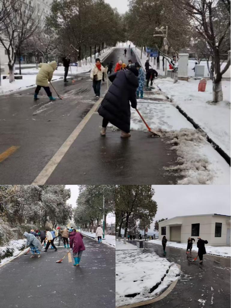 近日,黄石市迎来寒潮降雪,校园路面积雪凝冰,严重影响师生出行安全。后勤管理中心闻雪而动、迅速响应,积极组织环卫管理科、教室管理科、宿舍管理科等多科室全员上阵,开展校园扫雪除冰行动,筑牢校园安全防线。