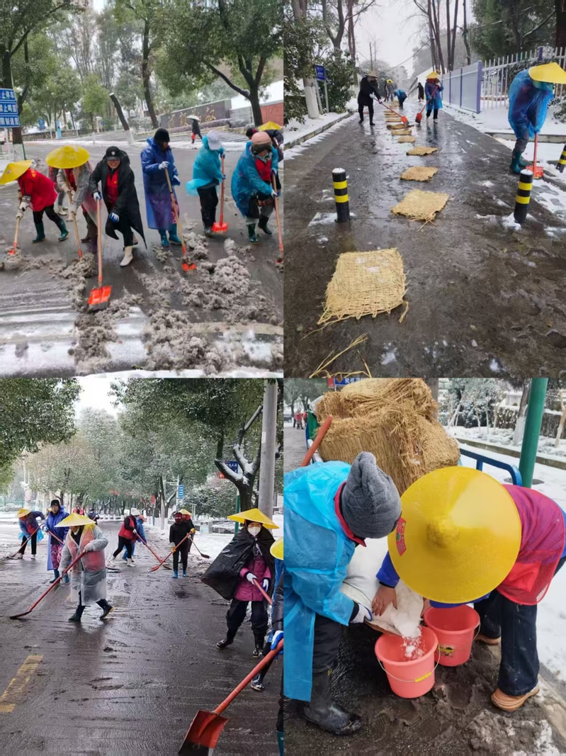 环卫管理科职工们身披雨衣,顶风冒寒奔赴学校各大主要干道,挥铲破冰、扫雪清路,撒布融雪盐、铺设防滑草垫,用实际行动守护校园道路畅通,成为风雪中最温暖的风景。