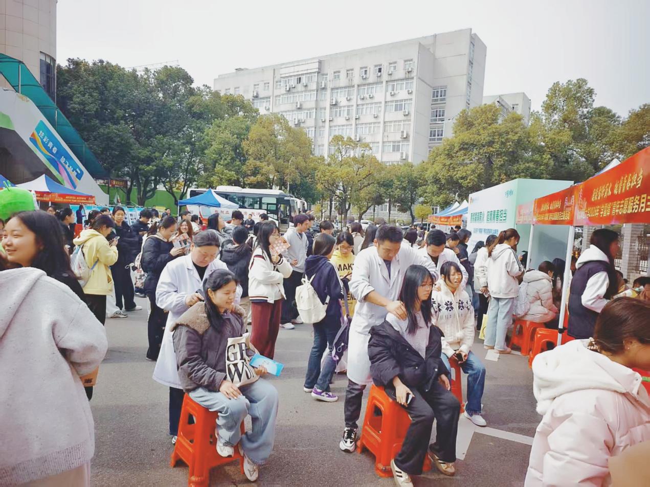 上午10时,公益义诊在琼林苑前广场准时开始。来自黄石普仁医院的专业团队,涵盖内科、外科、中医科、康复科、皮肤科等多个领域,为师生们提供了面对面的免费健康咨询与义诊服务。现场设有血压测量、中医把脉等项目,针对师生普遍关注的熬夜脱发、痛经调理、痤疮护肤、运动损伤等青春期健康问题给出专业建议。中医科与康复科的咨询点尤为受欢迎。中医专家通过细致把脉,为师生辨析体质、指导睡眠、肠胃及季节养生调理;康复治疗师则针对颈肩腰痛、运动损伤与体态问题,现场评估并传授拉伸技巧。